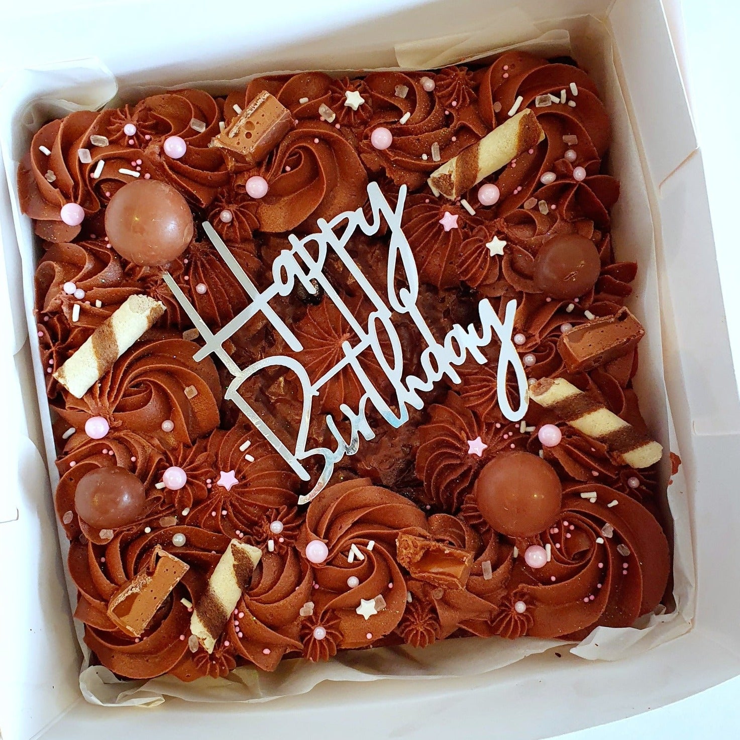 Who wants an ordinary brownie when you can have this delicious chocolate brownie? it's got a yummy chewy centre and big chocolate chunks throughout. We ice it with our dreamy chocolate buttercream and overload it with chocolates, sprinkles and glitter, and then pop on a Celebration disc.